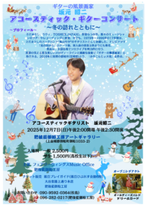 数々のミュージシャンのツアーやレコーディングに参加。1979〜1996年は“亀山社中”のギタリストとして活躍した坂元昭二のコンサート。美しいメロディーラインと繊細な演奏で“ギターの風景画家”と称されている。
