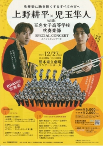 前半は若き天才管楽器プレイヤー上野耕平(サクソフォーン)と児玉隼人(トランペット)のソロ。後半は玉名女子高吹奏楽部との共演