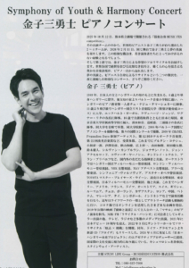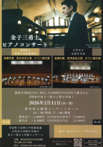 第1部は器楽合奏MUSIC FES,COMPETITIONで“MIYUJI賞”に選出された苓北町立富岡小学校器楽部と天草市立本渡中学校が、ピアニスト金子三勇士と共演。第2部は金子三勇士ピアノ・リサイタル。