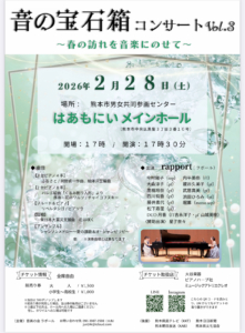 音楽の会ラポールによる、ピアノ、フルート、声楽の演奏会。2台ピアノ4手による「ふるさと」や、2台ピアノ8手による「バレエ組曲『くるみ割り人形』より 序曲・花のワルツ」、独唱「花は咲く」他。