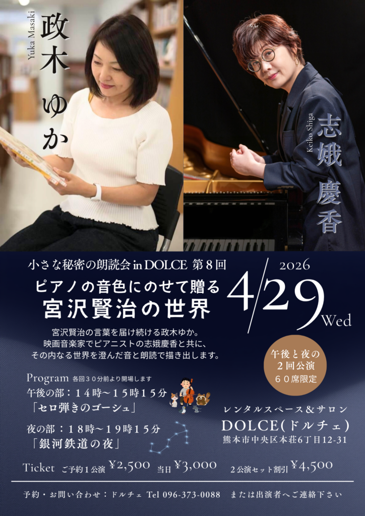 小さな秘密の朗読会 in DOLCE 第8回 ピアノの音色にのせて贈る 宮沢賢治の世界